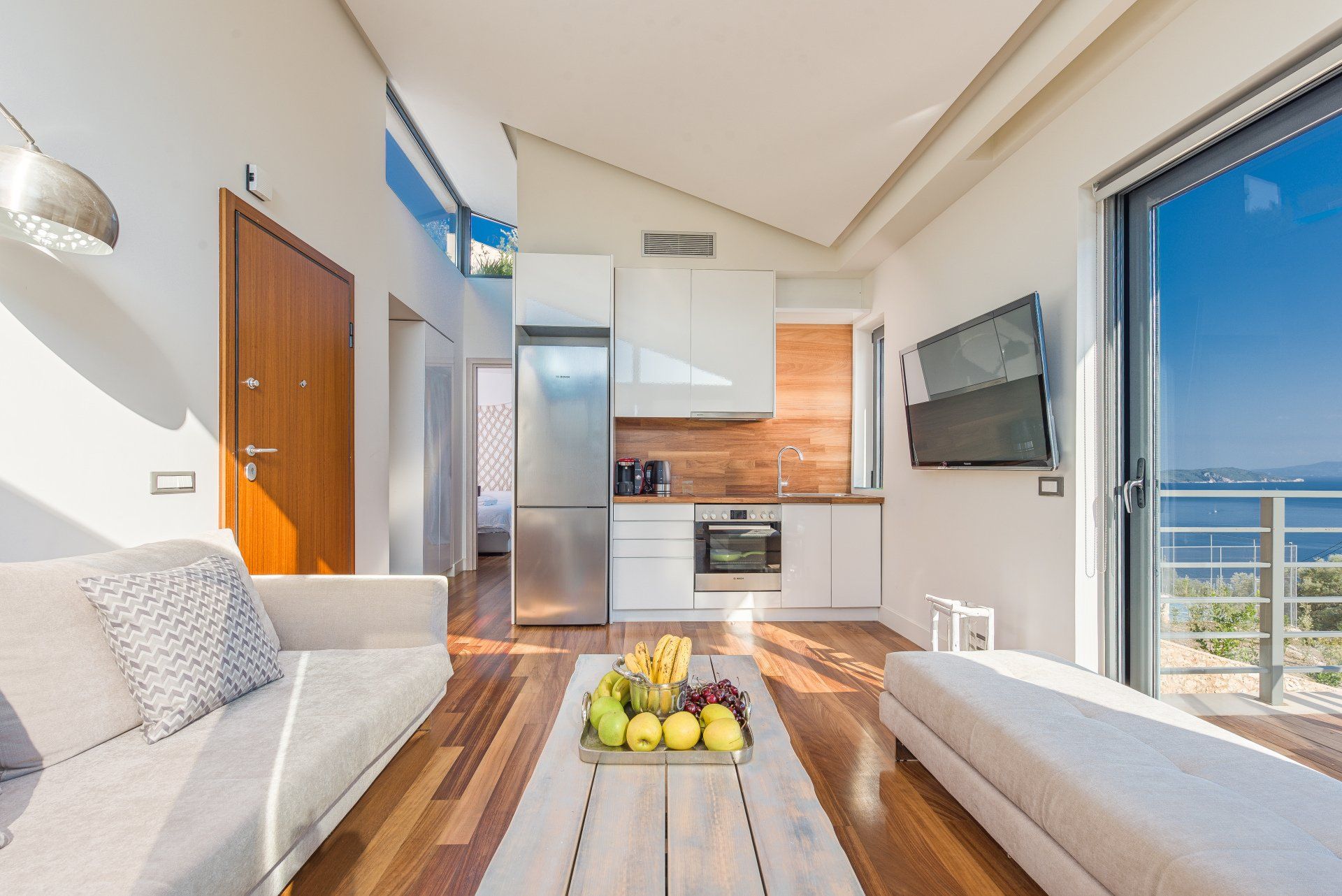 The main entrance is located at the ground floor. There you will find fully equipped open kitchen to the living area, one double bed bedroom and a bathroom.